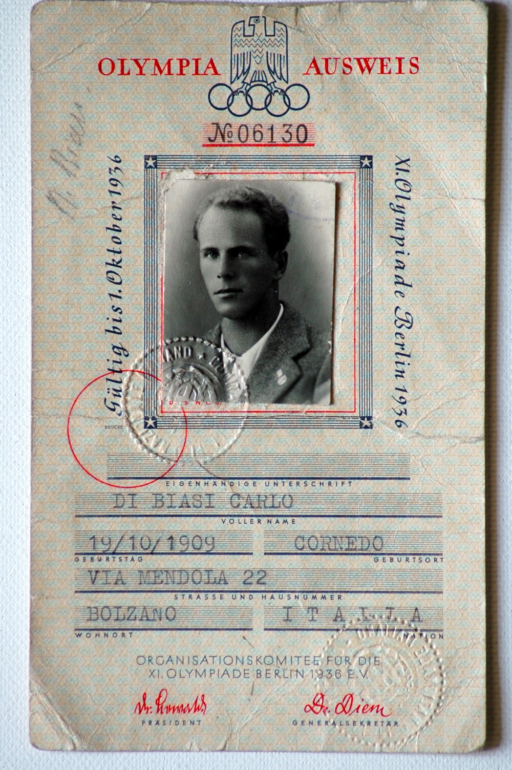 L'OLYMPIC PASS DI CARLO DIBIASI PER LE OLIMPIADI DI BERLINO 1936